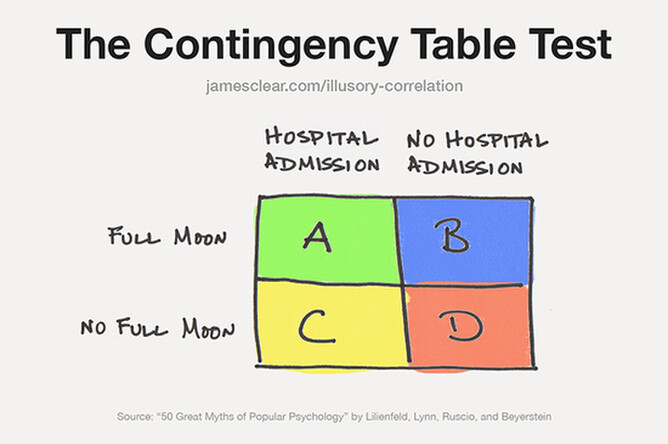 There is a simple strategy you can use to spot your hidden assumptions and prevent yourself from making an illusory correlation. It's called a contingency table and it forces you to recognize the non-events that are easy to ignore in daily life.Let's break down the possibilities for having a full moon and a crazy night of hospital admissions.